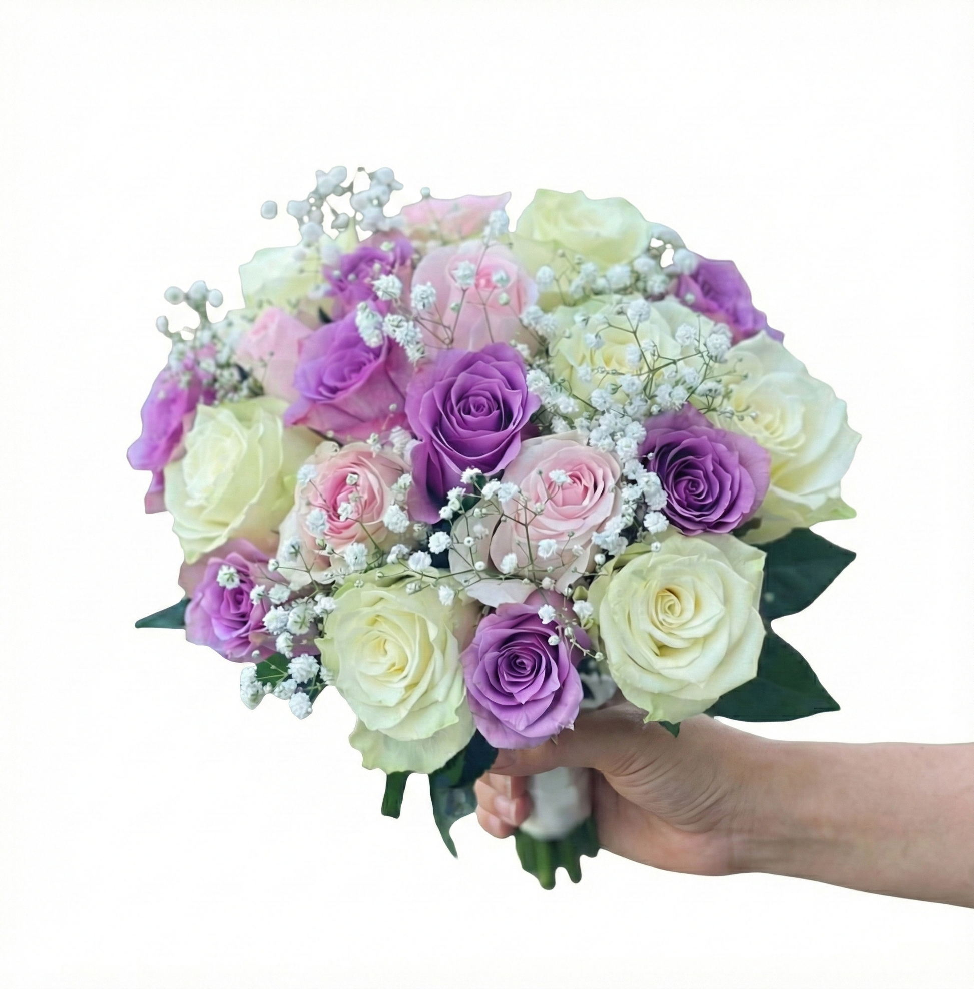 A romantic bouquet of 20 pastel roses, elegantly accented with baby’s breath. Perfect for weddings, symbolizing love and purity in every delicate details
