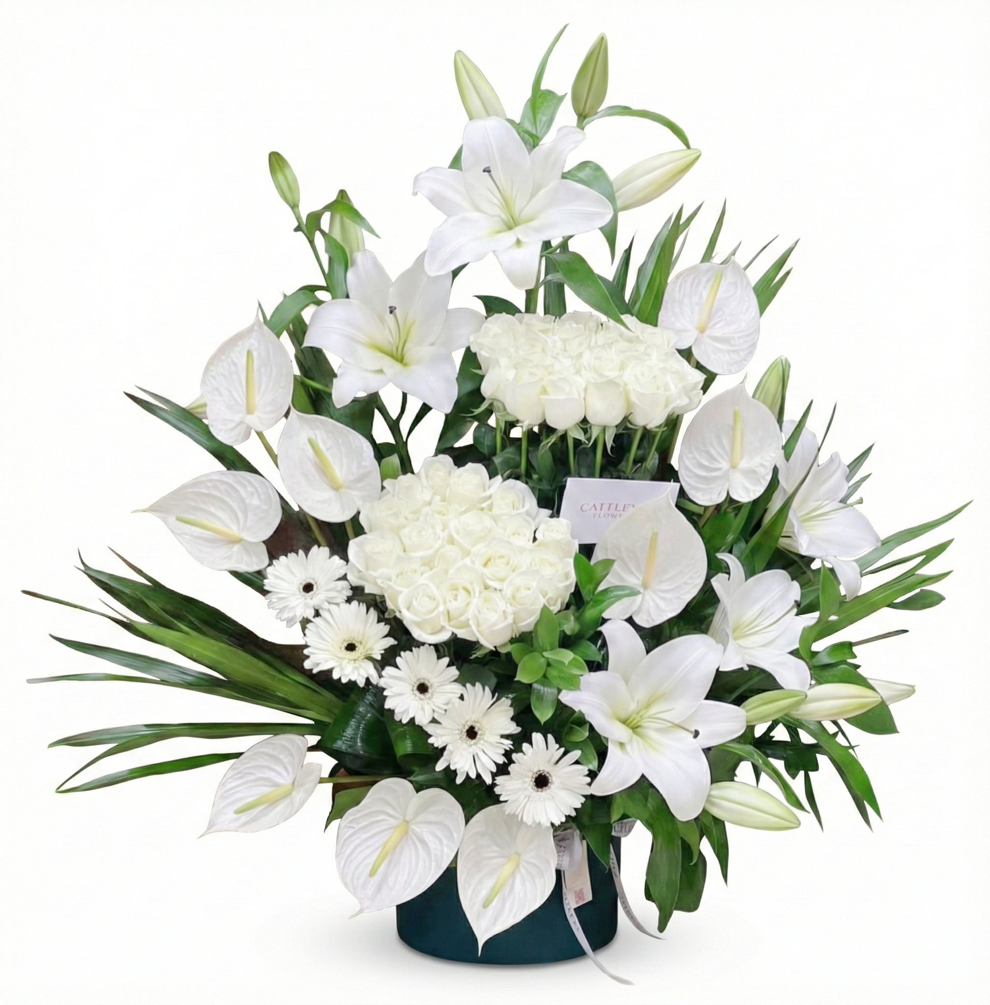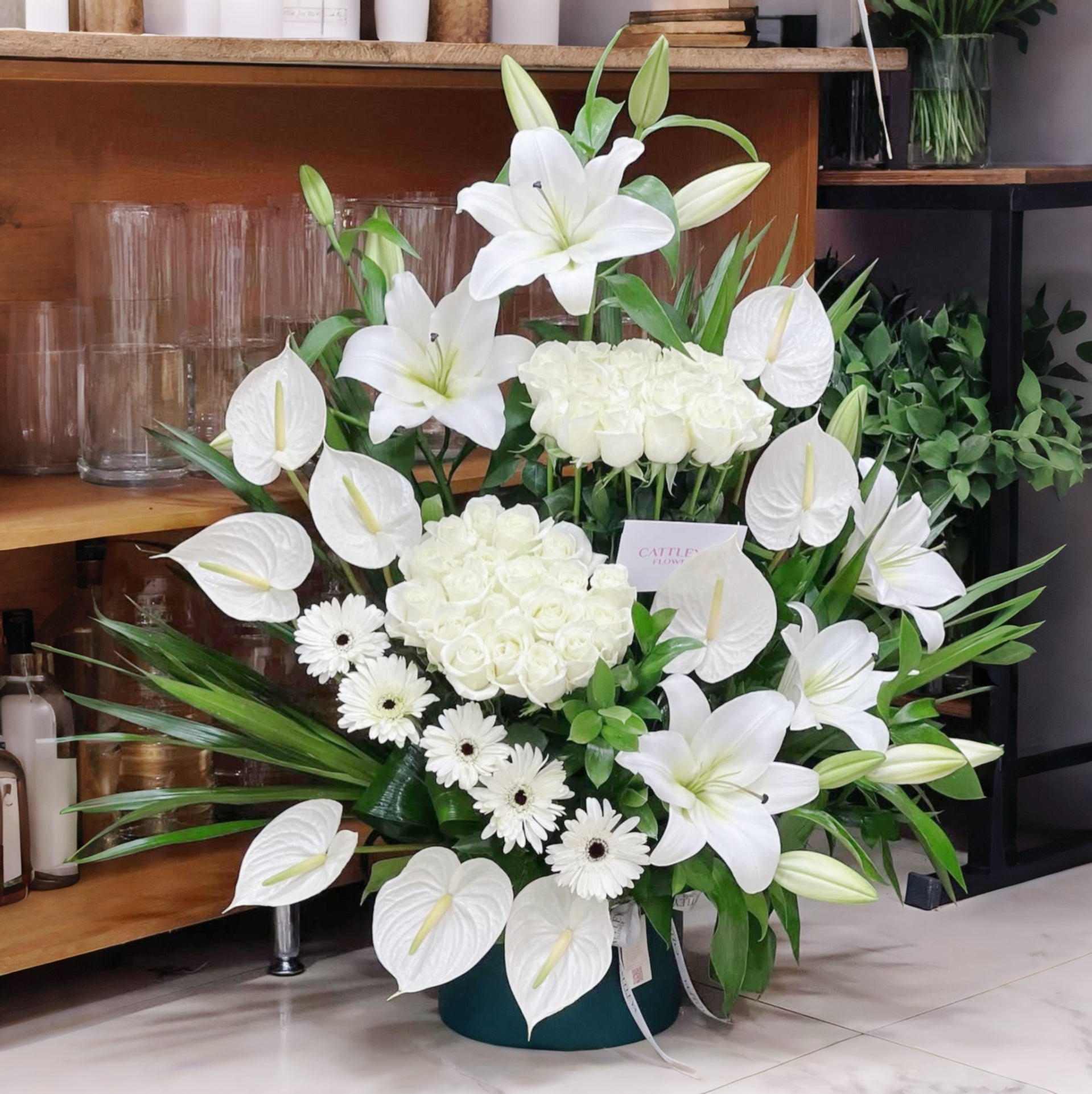 A luxurious box arrangement featuring 40 white roses, 9 exotic anthuriums, 5 fragrant lilies, and 5 gerberas. A grand statement of sophistication, perfect for weddings or expressing sincere devotion.
