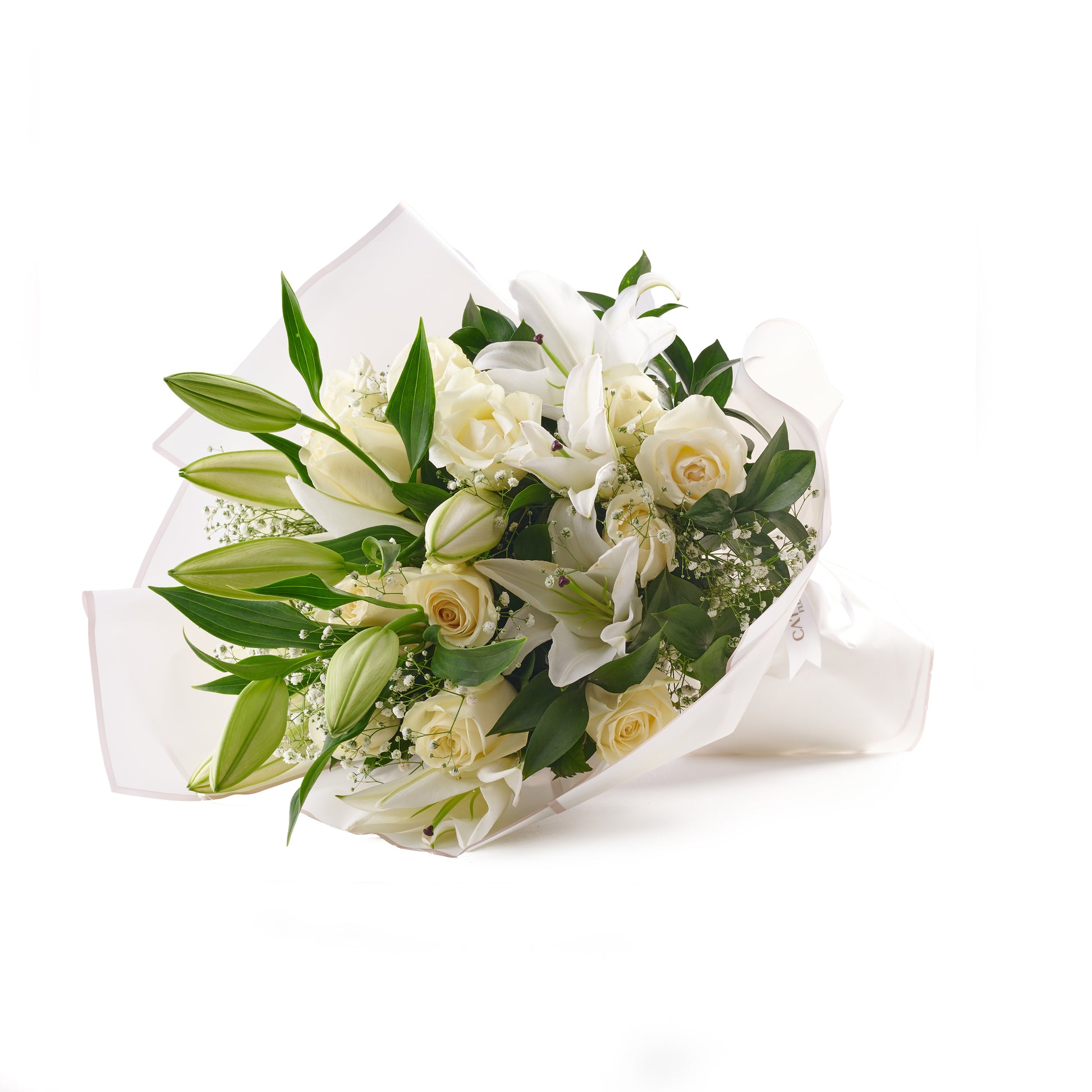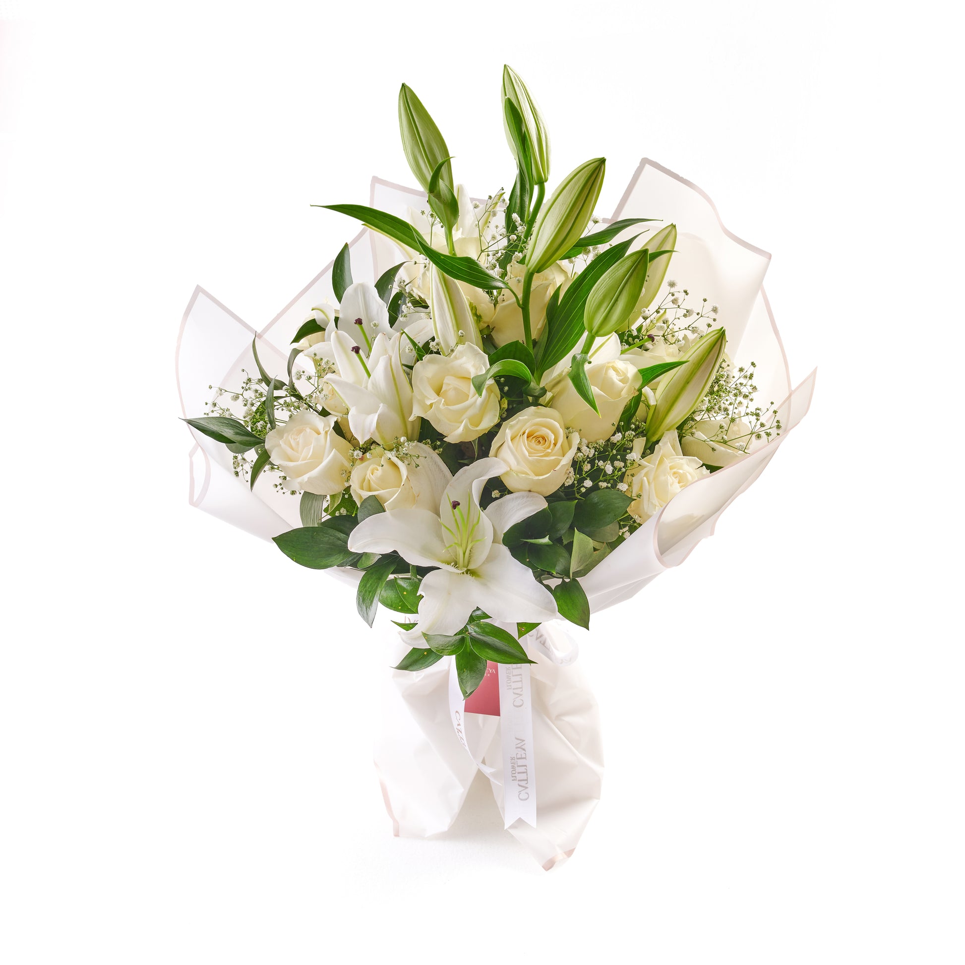 A graceful white bouquet featuring 3 lilies, 15 ivory roses, and baby’s breath, surrounded by rich greenery. Wrapped in crisp white with a satin ribbon, this design embodies serenity, purity, and timeless style.