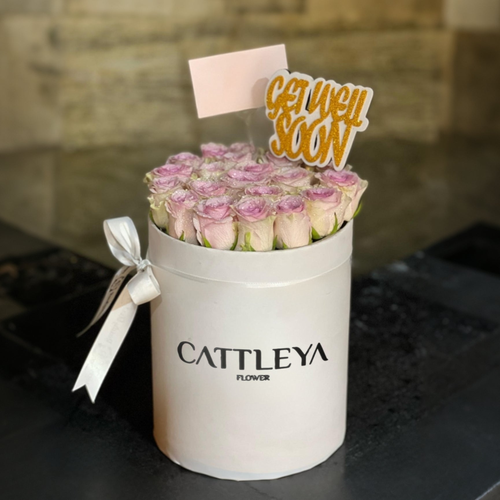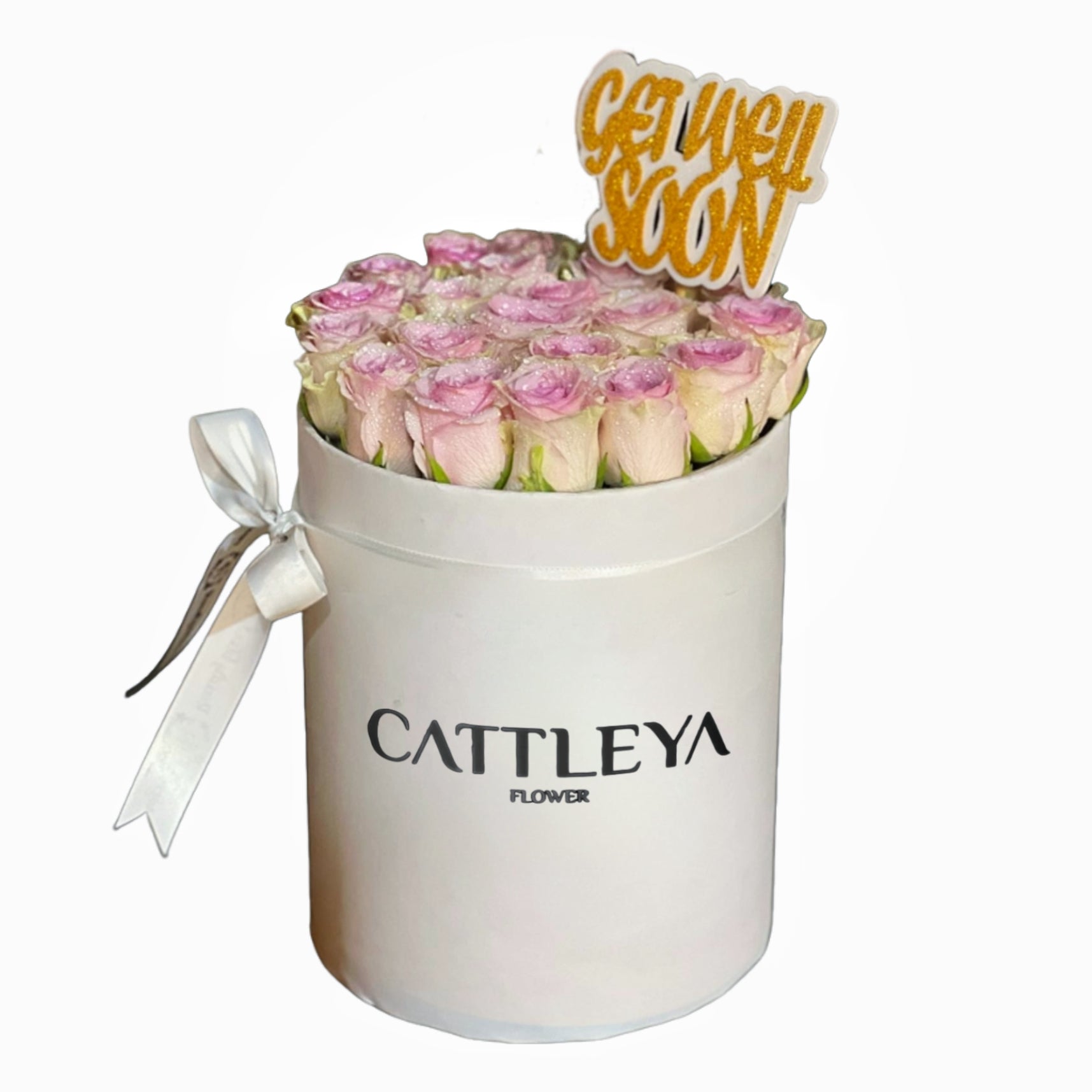 Box of 25 blush pink roses arranged in a sleek white leather box, delivering soft vibes of care and calm — perfect for a gentle get well soon gesture.